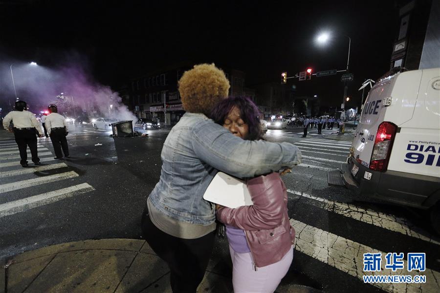 10月27日,在美國費城,兩名女子在沖突中互相擁抱。 美國賓夕法尼亞州最大城市費城26日晚間至27日凌晨發生警察開槍打死黑人男子引發民眾抗議事件,警察與示威者發生沖突,約30名警察受傷,數十人被捕。 新華社/美聯