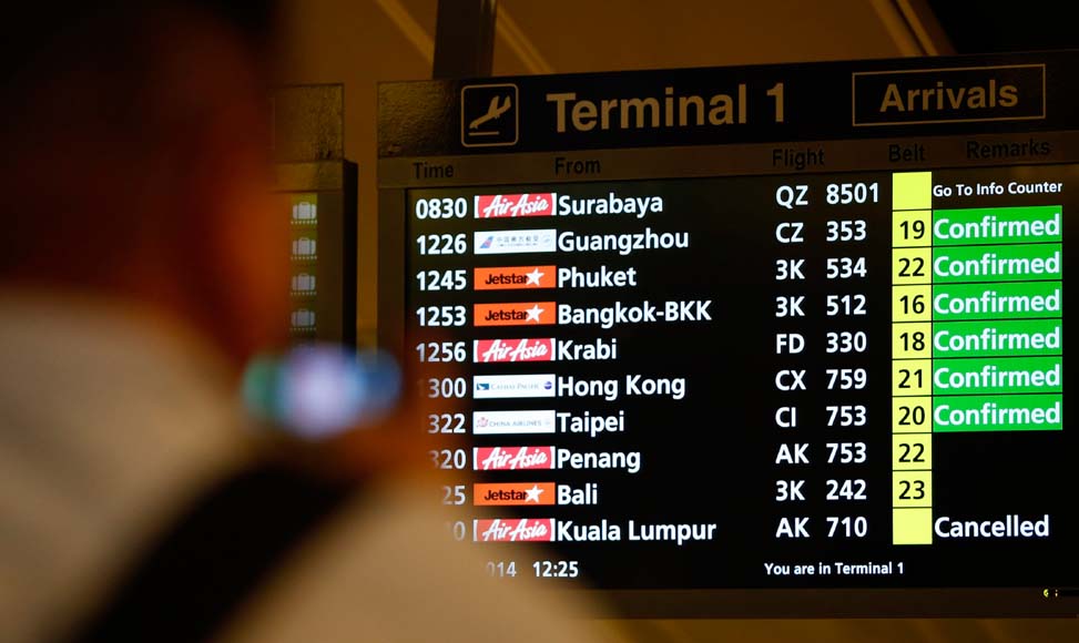 12月28日,在新加坡機場,航班電子信息牌上顯示,亞洲航空公司QZ8501航班未按規定時間抵達,人們需前往服務臺問詢。印度尼西亞交通部28日說,亞洲航空公司一架從印度尼西亞飛往新加坡的客機當天失去聯系,機上共有155人??蜋C原計劃從印尼的泗水飛往新加坡,本應于當地時間8:30分(北京時間8時30分)抵達。新華社/路透